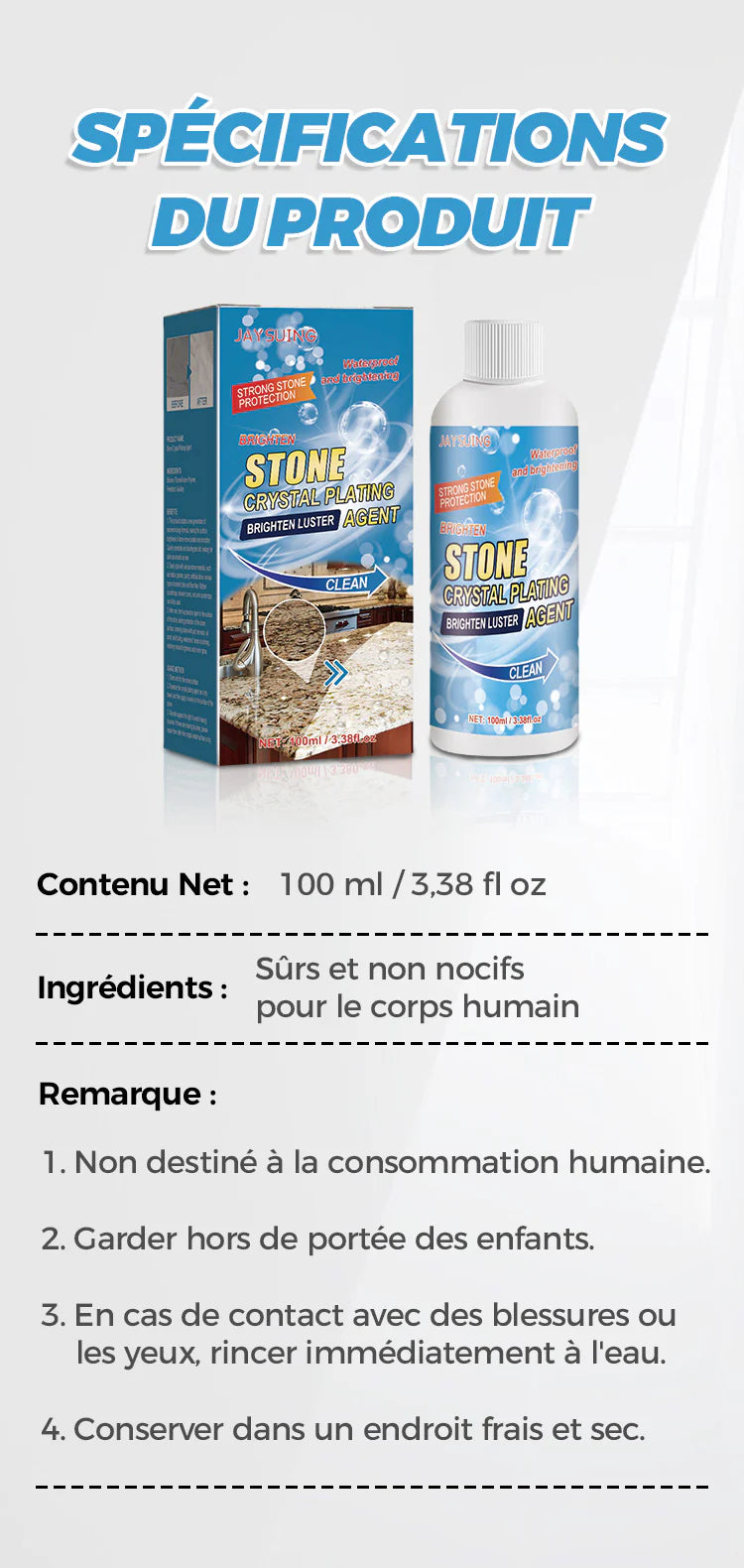 - Préserve la brillance du marbre et du granit poli